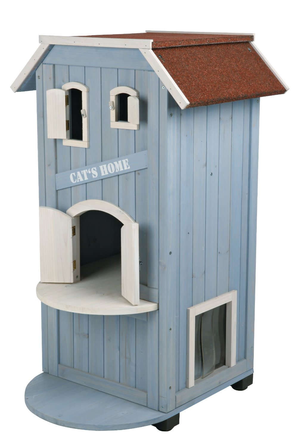 A 3-story wooden cat condo house with weatherproof finish. Primarely meant for outside, but definitely also for indoors. This awesome penthouse has hinged shutters and several peek-a-boo holes. How great is that? The Trixie has 2 smaller doors and 1 big one at the back. The latter is useful for maintenance. Its plastic flaps are there to keep the rain and wind out. Lastly. The raised floor allows air to circulate. |